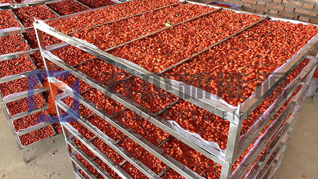 烘干枸杞三階段為降速烘干階段。當(dāng)枸杞含水降到需定數(shù)值(30%左右)后,果內(nèi)的導(dǎo)熱性變小,內(nèi)外溫差增大,當(dāng)室內(nèi)熱空氣達(dá)到55℃-60℃時(shí),由于枸杞水分越來越少,水分的外移蒸發(fā)速率下降,水分滲出緩慢,所以還需相當(dāng)?shù)臅r(shí)間來緩慢排出。