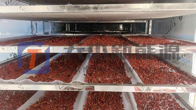 烘干枸杞二階段為恒速烘干階段。新鮮枸杞由于果內(nèi)的水分外滲,皮層聚集多的非結(jié)合水分,這是因?yàn)楸砻娴乃魵鈮号c溫度氣壓基本相同,壓迫枸杞內(nèi)部水分很快移向表面以滿足表皮水分汽化的需要。枸杞內(nèi)失水率達(dá)到近50%時(shí),機(jī)內(nèi)溫度自然上升到50℃-55℃,循環(huán)風(fēng)速可有所下調(diào),枸杞內(nèi)含水越少,脫水時(shí)間越短。大量地脫水使枸杞體形縮小,即平常說的呈半干狀態(tài),此期稱重測(cè)水,枸杞內(nèi)含水30%左右。