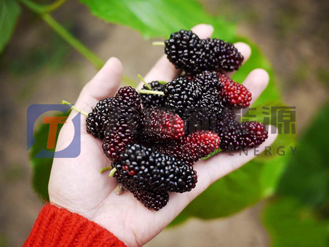 2)設(shè)置桑椹烘干機(jī)烘干參數(shù):桑葚是高糖分、高水分含量的漿果,較長果形是由一個一個小果囊的形狀組成,水分難以出來,所以需要較長的時(shí)間。同時(shí)烘干溫度又不能太高,溫度太高,就容易影響花青素的含量。烘干①階段升溫一小時(shí),不排濕,烘干模式,讓桑椹烘干機(jī)上升到50度左右。②階段設(shè)為烘干+排濕模式,目標(biāo)濕度為60%,目標(biāo)溫度設(shè)為55度。第三、第四階段每一階段上升5度,目標(biāo)濕度下降10%,讓桑葚烘干機(jī)不斷排濕。末尾階段目標(biāo)濕度設(shè)為15%左右。如果條件許可,可以考慮在第四階段末了,停機(jī)靜置一段時(shí)間再復(fù)烘,這樣果干內(nèi)部的水份滲出后被復(fù)烘的熱量加熱揮發(fā),果干果形好,同時(shí)總體能效好。