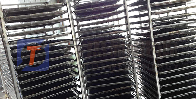 1)桑葚裝盤:使用桑椹烘干機(jī)烘干處理,時(shí)間要18個小時(shí)就可以烘干處理完了。一般每4公斤鮮桑葚可制成1公斤桑葚干。將經(jīng)整理去雜后的桑葚裝入托盤,送進(jìn)物料車內(nèi)。每臺物料車不宜超過14個托盤,托盤層間距控制在10公分左右。以10P機(jī)為例,不要超過10臺物料車,以保證桑葚烘干機(jī)內(nèi)有合理間隙位,利于熱風(fēng)通過。