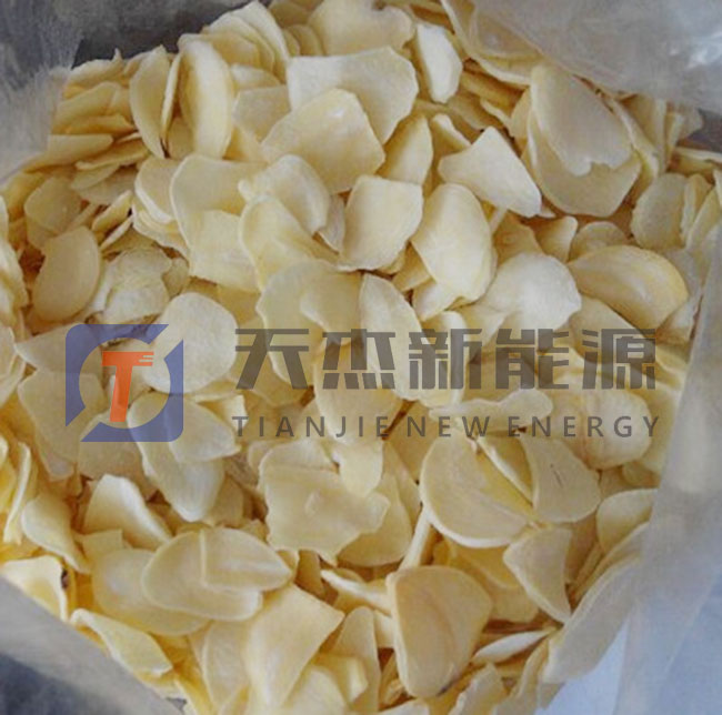 蒜片烘干: 將蒜片均勻鋪放在大蒜片烘干設(shè)備的物料托盤上,溫度控制在55-60℃左右,烘6-8小時。烘干過程中,注意蒜片烘干機(jī)設(shè)備的干燥,熱風(fēng)量和排濕氣量要穩(wěn)定,到后期烘干時,由于大蒜纖維細(xì)密且蒜片中液體黏稠,使蒜片水分遷移蒸發(fā)變得緩慢,直到蒜片烘干到含水率約為4-6%以內(nèi)即完成烘干。烘干期間須嚴(yán)格控制好時間和溫度,以免烘干時間過長,溫度過高,使蒜片干色澤、外形及營養(yǎng)價值受損,影響蒜片的品質(zhì)。