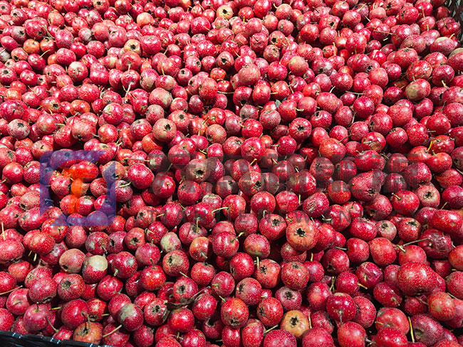 1、首先將山楂洗凈切片,厚度約2CM,采用切片機(jī)完成,這樣可以保證山楂片厚度均勻,在烘干的過程中也能夠受熱均勻,利于循環(huán)排濕。
