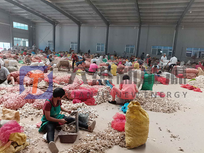 先將有傷疤、軟爛干癟的大蒜頭剔除,選擇手感硬實、蒜瓣完整、顆粒飽滿、蒜肉潔白的大蒜頭。在將大蒜去皮、切片,清洗后輸送至已設置好參數(shù)的大蒜烘干機內(nèi)。