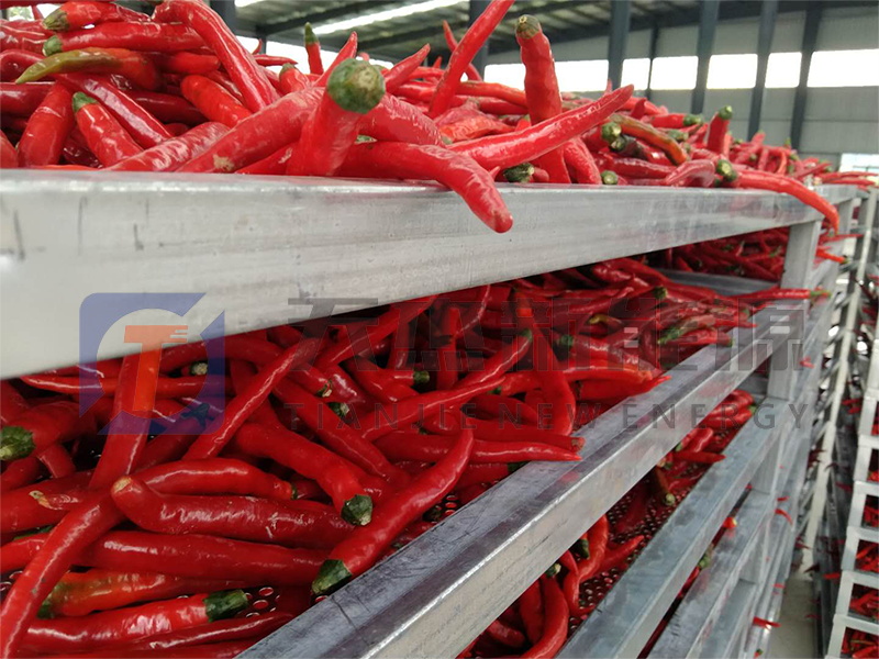 辣椒推入烘干房之后,我們根據(jù)不同的烘干要求,設置相應的烘干參數(shù),同時在烘干過程中根據(jù)實際情況,做出相應的烘干調(diào)整。辣椒烘干過程不需要進行翻動,直到烘干完成。烘干一批次之后,進行下一批次的烘干。這種適用于家用,種幾畝地的農(nóng)戶。